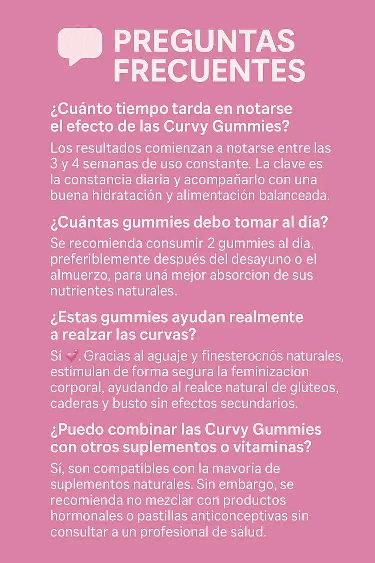 Si tienes alguna condición médica o estás bajo tratamiento, lo mejor es consultar con tu médico antes de empezar a tomar Curvy Gummies 💕.